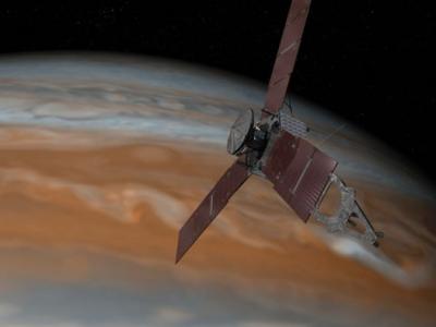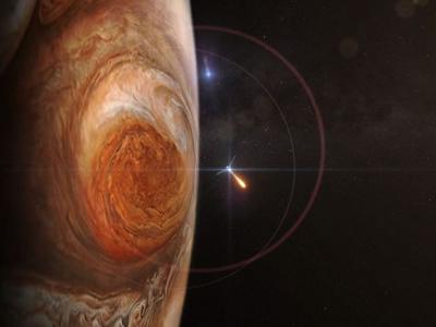 画家笔下朱诺号进入木星轨道情形。 朱诺号当年搭载“宇宙神-5”运载火箭,从佛...