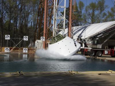 25日在维吉尼亚州的汉普顿「NASA兰利研究中心」的撞击模拟池进行测试 (神秘的地...