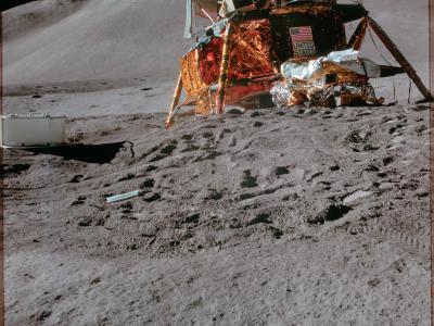在第一次阿波罗15号月球表面EVA期间,宇航员在部署月球表面设备之前,在哈德利-亚平...