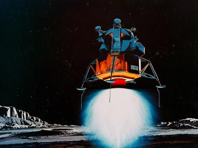 TRW公司的艺术家概念描绘了阿波罗11号登月舱(LM)下降到月球表面。这是艺术家1969年...