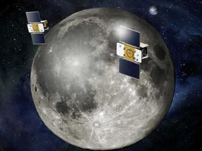 在轨道中飞行的两颗月球引力探测器(“埃布”和“弗洛”) 两颗引力探测器撞击...