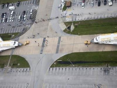 昨天,肯尼迪航天中心,发现号航天飞机(右侧)和奋进号航天飞机排成难得一见的面...