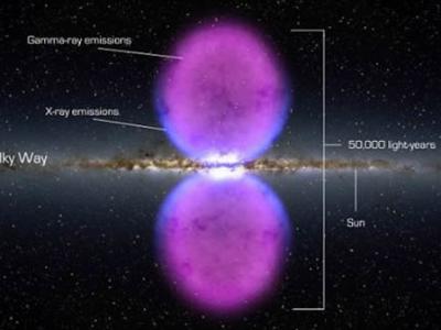 科学家指出从银河系平面向外延伸并放射伽玛射线的两个巨型泡泡可能是发现暗物质的...