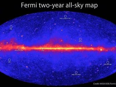 美国宇航局费尔米伽马射线望远镜两年观测数据形成的伽马射线宇宙全景图,较明亮色...