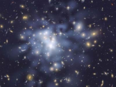 图中的蓝色区域就是科尔和同事们在哈勃望远镜的图像上叠加上的暗物质分布图 借助...