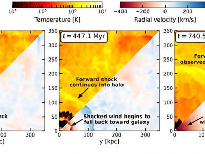 从1.81亿年开始,模拟了三个不同时期的星爆驱动风。每幅图像的上半部分显示气体温度...