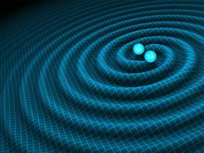 重力波示意图。 当物体加速度前进时 (如两个超大质量星体互绕),会使空间的扭曲发生...