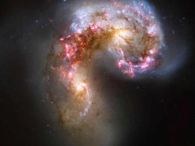 该图显示了附近的辐射线星系NCG 4038 - 4039.这张图中的粉色部...