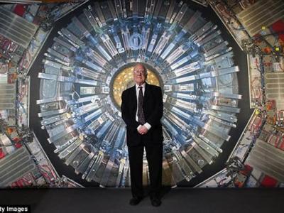 在伦敦举行的“科学博物馆对撞机展览”期间,皮特·希格斯教授站在一幅大型强子对...