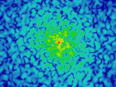 极轻暗物质电脑模拟中的暗物质晕(dark matter halo),孤立子位于中心高密度的红色...