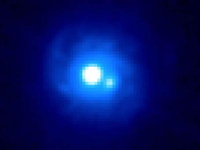 哈勃空间望远镜拍摄的B0218+357引力透镜效应图像,可以看到两个分开的像,彼此相...