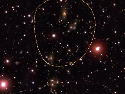 布兰科望远镜观测图像中绘制出了星系团的范围,通过对不同时间尺度上星系团的研究...