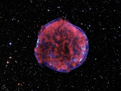 钱德拉X射线天文台拍摄的第谷超新星残余物。图片中低能量的X射线(红色)显示了超...