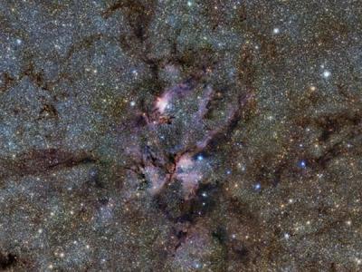 欧洲南方天文台VISTA红外巡天望远镜拍摄到了炙热气体云和卷须般尘埃围绕炽热年轻...