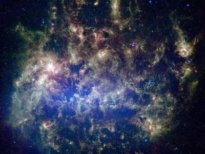 欧洲空间局的赫歇尔空间望远镜拍摄到W3巨型分子云的高清图像,由70微米(蓝色)、1...