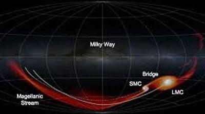 大麦哲伦星云(LMC)和小麦哲伦星云(SMC)发生碰撞的时候,大麦哲伦星云从它的邻...