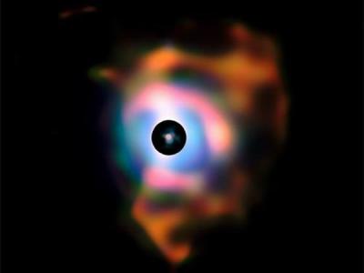 明亮的涡流气体星云环绕在一颗著名超巨恒星周围呈现出彩虹般的色彩 据美国太空网...
