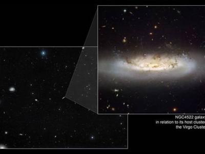 哈勃望远镜拍摄到的室女座星系簇中的NGC 4522星系 图像显示的是宇宙风将之前的...