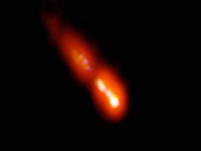 甚长基线阵列(VLBA)望远镜观察到128亿光年外PSO J0309+27星系核心喷射出的物质(神...