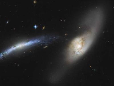 哈勃太空望远镜捕捉到两个星系(NGC 2799和NGC 2798)正在合并产生的壮观“水龙卷”...