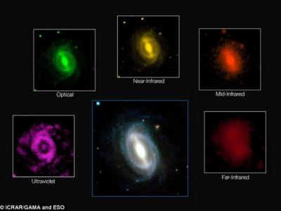 如图所示,这是一个典型星系在不同波长下的图像。最新研究显示,宇宙正处于不断衰...