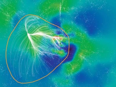 天文学家绘制出超星系团Laniakea的地图,橙线范围内便是Laniakea,中央蓝点是银河...