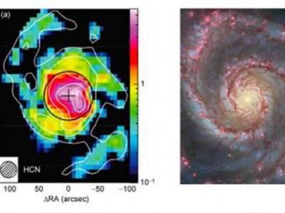 左: M51星系盘上致密分子气体分布; 右: 哈勃太空望远镜观测的M51星系盘上的恒星分...