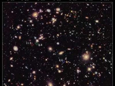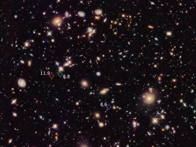 七个星系在哈勃超深空区域的位置 天文学家最近用哈勃望远镜捕捉到比以往任何时候...