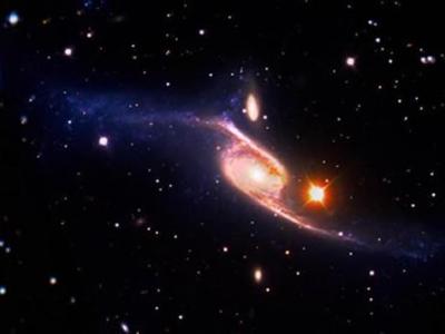 这张NGC 6872星系图像是结合欧洲南方天文台甚大望远镜可见光观测数据、GALEX探测...