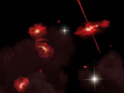 新发现的奇特超红星系的艺术想象图 在距离地球几乎130亿光年远的遥远宇宙中,潜...
