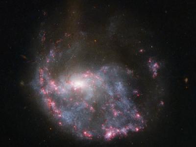 这张美国宇航局/欧洲航天局哈勃太空望远镜拍摄的NGC922图片显示了旋转星系附近亮...