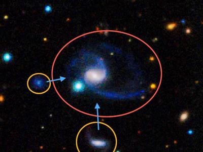 近日发现的两个“精确匹配”银河系的星系之一。较大的星系名为GAMA202627,清晰的...