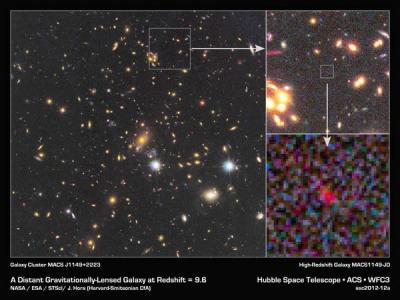 左侧的大图中是一个巨型的星系群,编号为MACS J1149+2223,其占据了整个视野的大...