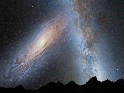 37.5亿年后地球的夜空。天文学家表示,仙女座星系(图左)将大面积出现在视野范围...