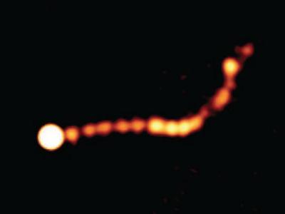 长度达2百万光年的星系喷流形似引擎喷射图案 科学家在对一个遥远星系的观测中,...