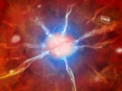 这位艺术家的概念展示了一个假设的事件,称为超千新星。一颗大质量恒星在超新星爆炸...