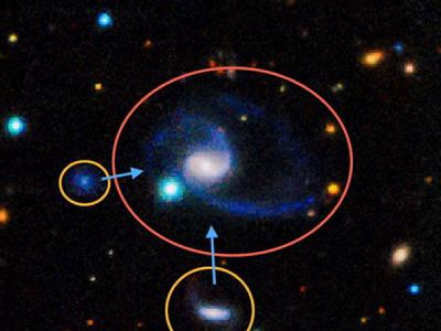 这个较大的星系被命名为GAMA202627,它与银河系十分相似,在图像底部左侧有两个较...