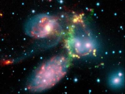 冲击波:一股绿色的光弧从斯蒂芬五重星系区域爆发而出 是哈勃望远镜拍摄的斯蒂...
