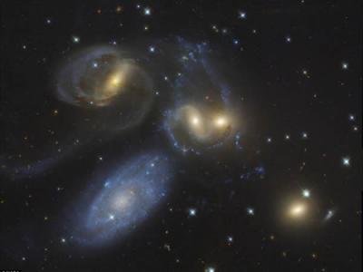 这张令人惊叹的照片显示的是5个紧密聚集在一起的星系。其中4个黄色星系是一个经常...