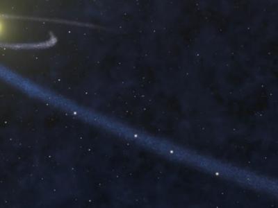 展示了3I/ATLAS的艺术想象图,它经过太阳附近,照亮了彗星的一侧。彗星靠近太阳的一...