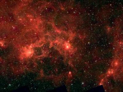这些强壮新生恒星释放光线加热环绕的气体灰尘云,在太空中形成一个直径大约100光...