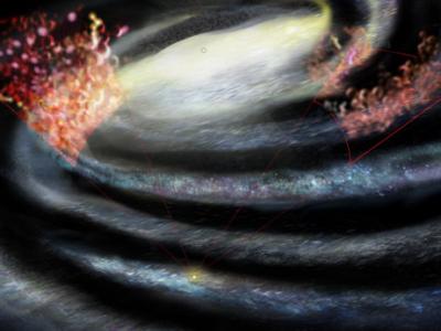 这位艺术家的作品描绘了一股从星系VV 340a中心超大质量黑洞喷发的进动喷流。 (图片...