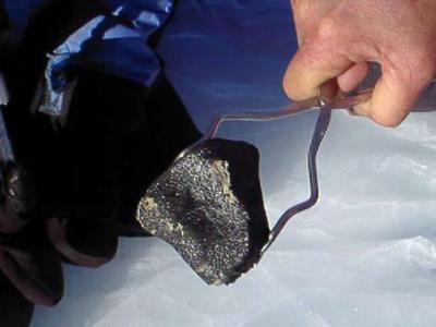南极陨石搜寻计划的志愿者正在寻找陨石。该陨石上闪闪发光的熔变壳表明它可能是一个...