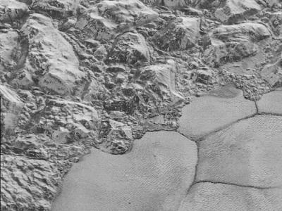 冥王星史普尼克平原与山脉分界的部分面貌 冥王星上部分地方受严重侵蚀,形成名...