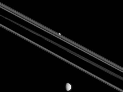 卡西尼探测器最新拍摄到土星两颗卫星,图中远处是土卫一,近处是土卫十七。 (神...