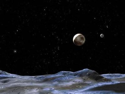 艺术效果图:冥卫三上看到的星空。左边是冥王星,右边是冥卫一,冥王星左边远处亮...