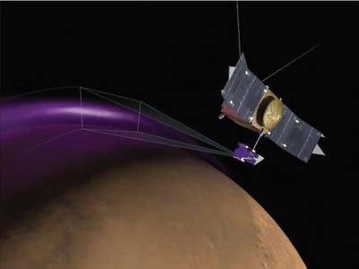 艺术示意图:MAVEN观测到火星北半球大气深处出现的极光现象。 MAVEN飞船搭载的...