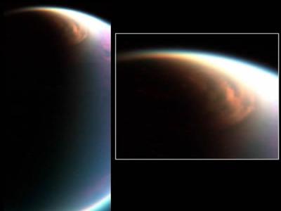 美国宇航局卡西尼飞船拍摄到土卫六北极上空平流层内存在甲烷云,这些图像是卡西尼...