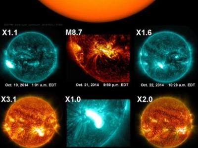 美国宇航局探测到AR12192黑子活跃区产生了6次X级太阳耀斑,这是最大级别的太阳耀...