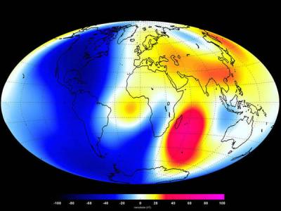 红色阴影部分代表磁场增强地区,蓝色则显示了在过去6个月磁场减弱的地区。 (神...